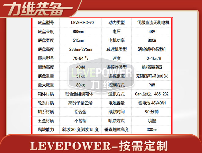 履帶底盤長888mm,履帶底盤寬515mm,履帶底盤高296mm,PWM無線遙控履帶底盤通訊方式:Can總線,485,232.箱體采用鋁合金材質(zhì)焊接而成,防腐性能好。履帶底盤動(dòng)力采用48V800W直流無刷電機(jī),渦輪蝸桿減速機(jī)動(dòng)力更強(qiáng),轉(zhuǎn)彎靈活。履帶底盤電池采用48V40AH鋰電池,續(xù)航時(shí)間更長,是一款不錯(cuò)的機(jī)器人橡膠履帶。